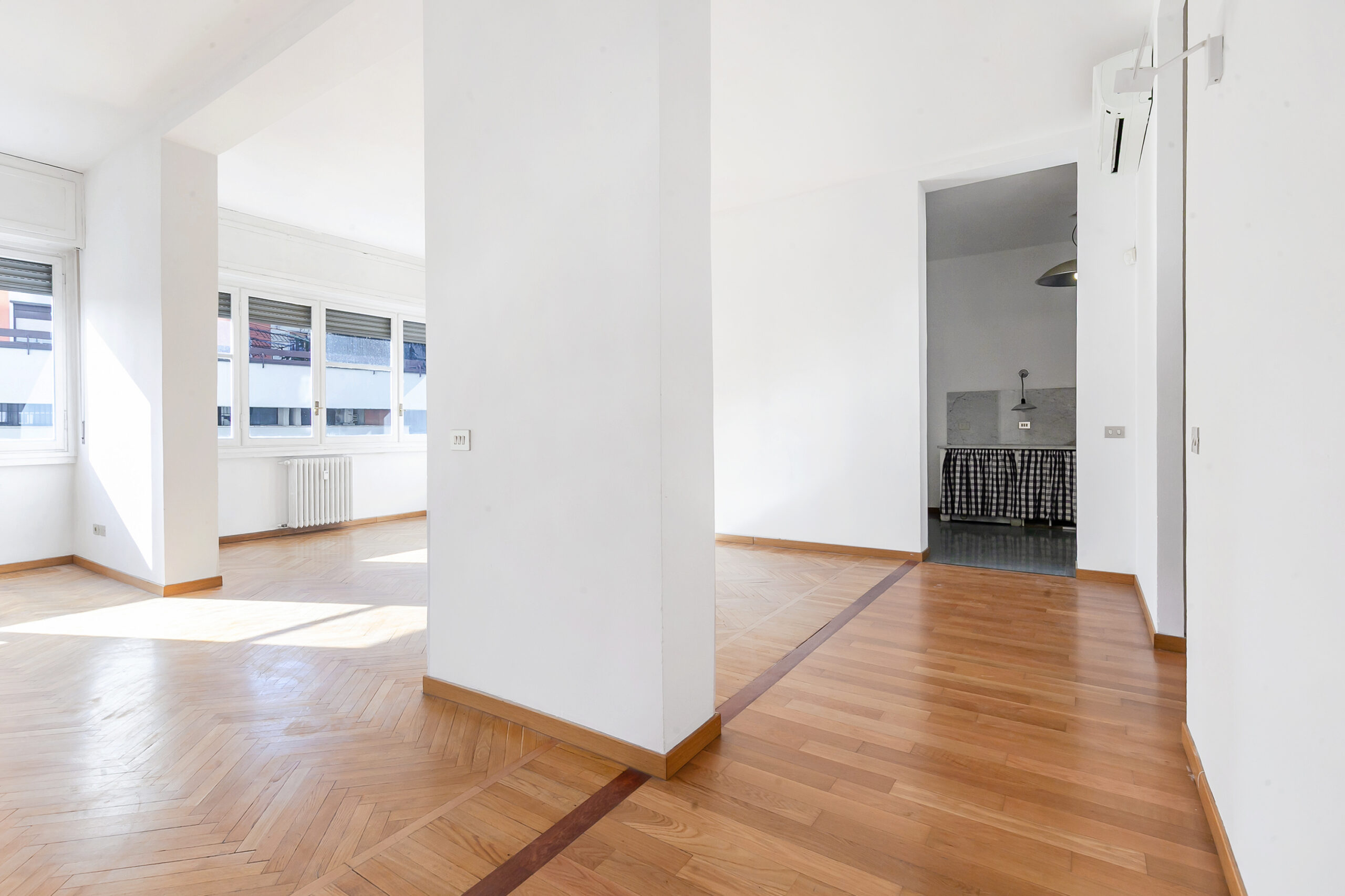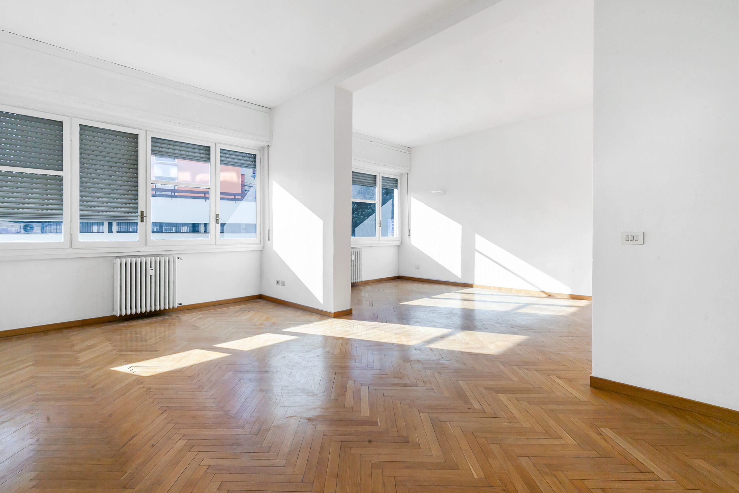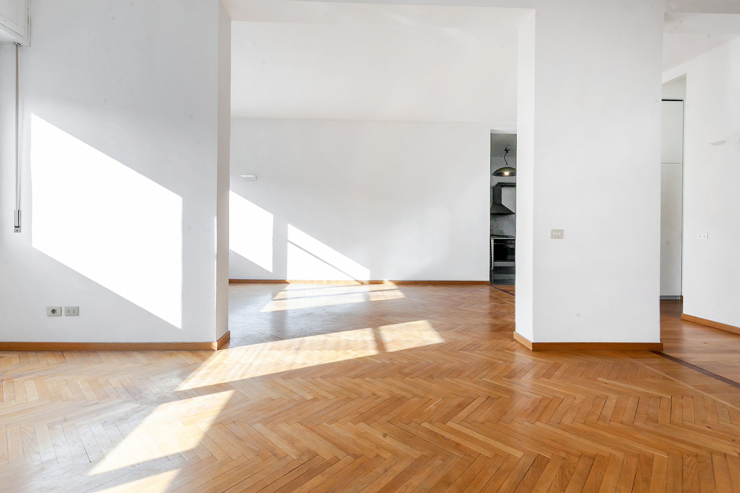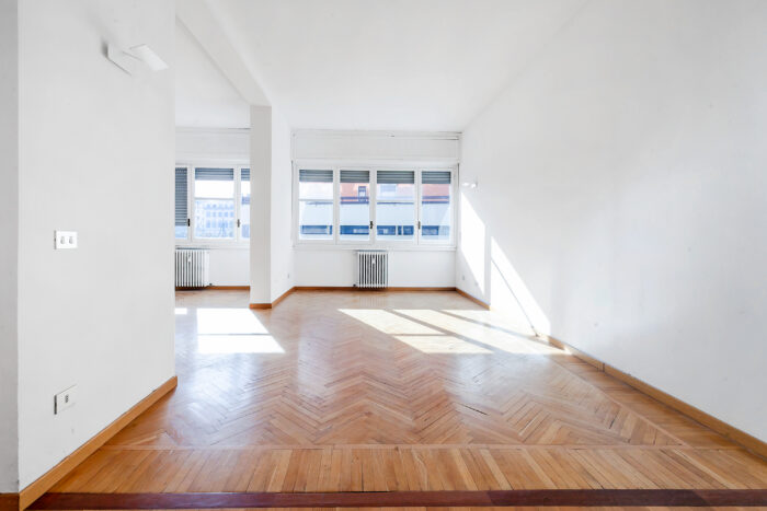 L’ingresso apre su un soggiorno doppio, ampio e arioso, valorizzato da grandi finestre e da una luminosità costante, favorita dall’esposizione e dalla bassa altezza degli edifici di fronte.